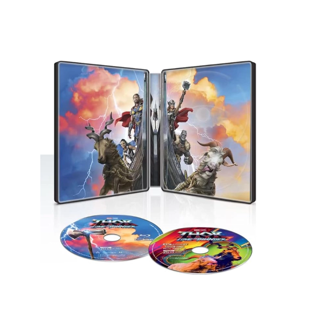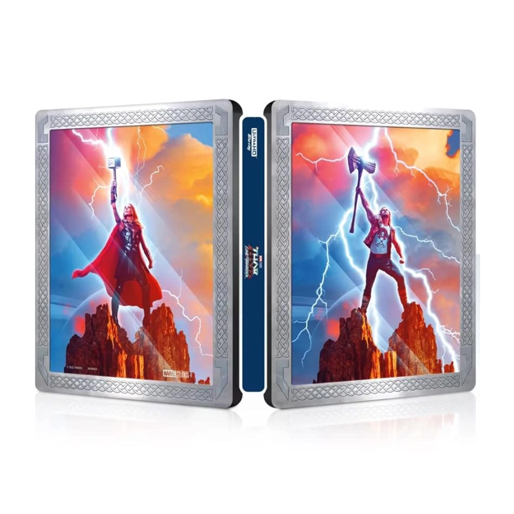 Steelbook de Colección: Estuche metálico con arte exclusivo de Thor sosteniendo el Stormbreaker, ideal para exhibir en tu repisa.